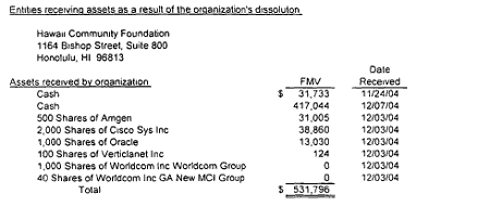 It looks like the collapse of tech stocks were not kind to the foundation. According to the foundation's final tax return, it lost a total of $116,997 during 2004 when its stock portfolio was liquidated, including worthless stock in Flag Telecom Holdings Ltd which had originally been purchased for $25,302. It also turned over 1,000 shares of Worldcom with a fair market value of zero.