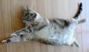 | Feline Friday again, so I grabbed the camera to get an update. That's Mr. Duke almost hitting what we call a "full rug" position, stomach fully exposed and body relaxed. He just needed to flip that front leg over to the side for a second to get the highest marks. It seems to be a favored position in hot weather. |