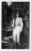 | Helen Lind, reporting for duty. My mother just came across this photo and passed it on to me. It was taken shortly after the Pearl Harbor attack, probably in early 1942, in the yard where my parents were living at the time, which was on Kealaolu Avenue in Kahala just mauka of the corner of Farmers Road. Later that year, they moved down to the house they've lived in for about 64 years now. She says the rifle wasn't really part of her responsibilities, but everyone had to have a gas mask. |