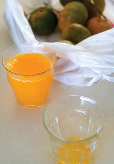 Freshly squeezed juice at home on Sunday morning, Kaaawa, Hawaii. January 2007.