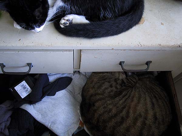 David Black made an unannounced appearance in the Star-Bulletin newsroom yesterday, huddling with his local honcho Don Kendall and managing editor Frank Bridgewater in Frank's office before the group headed out to lunch. Some eyebrows went up when he walked in, but he probably just arrived a few days early for Saturday's company party.Needless to say, we're now worried about our cats' safety, as well as the safety of children and others. We hauled all eight inside last night and locked down all exits. Luckily, several have already altered their habits and are spending much of the day sleeping inside. Kili was back in the dresser drawer for about the third day in a row, joined this tme by Harriet, who lounged just above her.