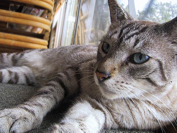 But Harry's been out in the rain, and just arrived at the screen door a few minutes ago, screaming to let us know that she wanted "IN". After a good rub with a dry towel, and a bowl of cat food, she's finally settling down. Kili's gone to sleep next to the computer. Initially she just settled down on top of the mouse, but I finally got it free. Lindsey is in the bedroom curled up on the top of a basket of clean laundry. Miki's sleeping on the bed. Wally is dozing on the top of the television. Lizzie is up on her cat tree, which we recently moved next to a window in the dining room. Leo and Silverman are somewhere outside, hopefully out of the rain.