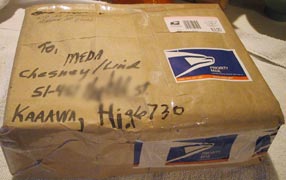 The box waiting for us in the one-room Kaaawa Post Office, looked like the poster child of the "suspicious mail" campaign, complete with lots of tape, irregular packaging, and hand-scrawled address. I was expecting it to set off some kind of postal response, but it somehow made it through their system, and was burped onto the counter right under the "suspicious mail alert" poster. But it turned out to be just a belated birthday present for Meda from her brother in Portland. Thanks, Mr. Bob.