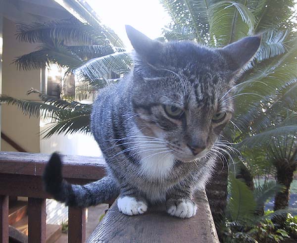 Meanwhile, I discovered where Ms. Lizzie has been disappearing to. I managed to track her going down our little hillside, meandering along through the plants at the bottom, out and across the road that runs straight up behind the Kaaawa fire station, and then she quickly ran up the driveway of house across the street and disappeared under the front stairs. The house is raised, and has a large storage area underneath which Lizzie has apparently turned into her own relatively private playground. Two days in a row I've come home, switched into garden shoes (the ones covered with mud), then followed the hidden path down the hillside, across the street, and found Ms. Lizzie happily under that house. She was happy to see me and cried loudly both times as she heard me coming, but I had to carry her back home with a firm grip on the back of her neck. Yesterday I talked to the woman who lives there, and introduced her to Ms. Lizzie, who as predicted was right under the front stairs.My guess is that Lizzie followed Lindsey over there at some point, since we've caught him on the other side of the street several times. Lizzie probably figured out that there aren't any other animals who live there, so it's virgin territory. It explains how she's able to disappear for long periods in heavy rain and not get wet. However, it's apparently partially disputed territory, sort of a boundary area where at least one black cat from down the street tests the defenses, and it may be where Lindsey got into his latest scuffle.