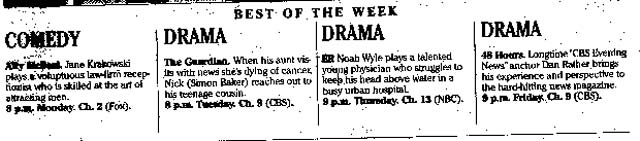 So much for maintaining the boundaries between news and entertainment, fact and fiction. This is the promo on the front of the Star-Bulletin's tv section for the week. Ally McBeal and the three Dramas. Which is the news program? Does it matter? In this presentation, they're all the same. ER and Dan Rather merit the same treatment. Just "Drama". And my apologies for the less-than-perfect scan.