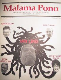 It seems I'm a cover guy for the new issue, but it's not flattering. The cover features my photo, with snakes dancing out of my head like halloween dreadlocks. The snakes, in turn, have the faces of Star-Bulletin editor and publisher, John Flanagan; managing editor Dave Shapiro; editorial page editor Diane Chang; and my wife, Meda Chesney-Lind. From the following 16 pages of invective, I presume that the union's state director, Gary Rodrigues, is unhappy with my reporting. Of course, he has refused since day one to be interviewed, and has instructed all staff to hang up if I phone, and respond with abuse if I show up in person. The result has been a long series of stories over 15 months.