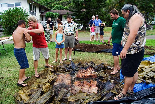 About ten hours after it was prepared, the imu was opened with a small before a small but appreciative group of onloookers, and the feasting lasted well into the evening.