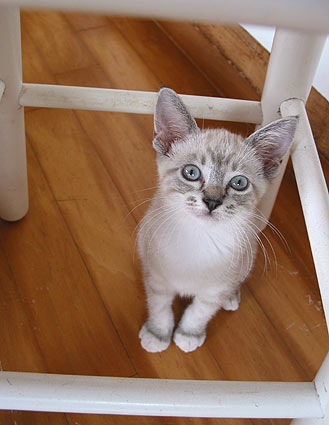 Here's Mr. Duke taking refuge under a stool in the kitchen, where he slows down long enough to strike a pose.
