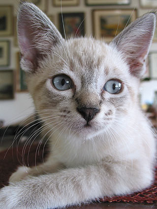 We're also anxiously watching to see if his eyes are going to change from their wonderful blue to some other color. I've read that the "true" eye color makes its appearance at about three months, so he's just hitting the transition stage (if it's going to happen). |