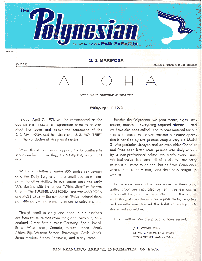 | This is the last issue of The Daily Polynesian, a shipboard newsletter published for some 40 years on the "White Ships" that cruised to Hawaii and the South Pacific for Matson and, later, Pacific Far East Lines, beginning in the 1930s. This issue, dated April 7, 1978, came out on the last day of the final voyage of the S.S. Mariposa. The ship's chief purser and editor of the Polynesian, the late James P. Yonge, was the uncle of iLind.net publisher Ian Yonge Lind. |