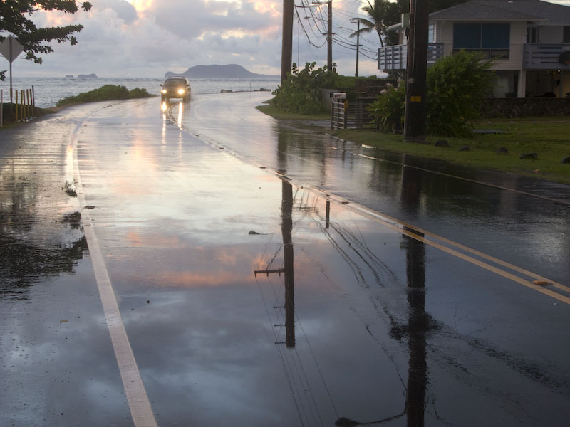 It started pouring this morning as we were walking past Kaaawa Fire Station and we were pretty wet by the time we took shelter over at Swanzy Beach Park, despite our deployed umbrellas. But as the rain passed, the clouds reflected the rising sun and it was a new day.