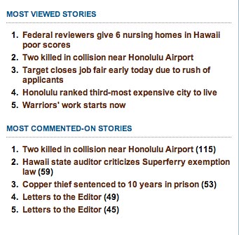 I checked Advertiser’s lists of most viewed and most commented-on stories over the course of the week, and stories from the series crept onto the list only occasionally after Day 1. These were the lists as of Thursday afternoon. That’s far out of proportion to the resources and space poured into the project.