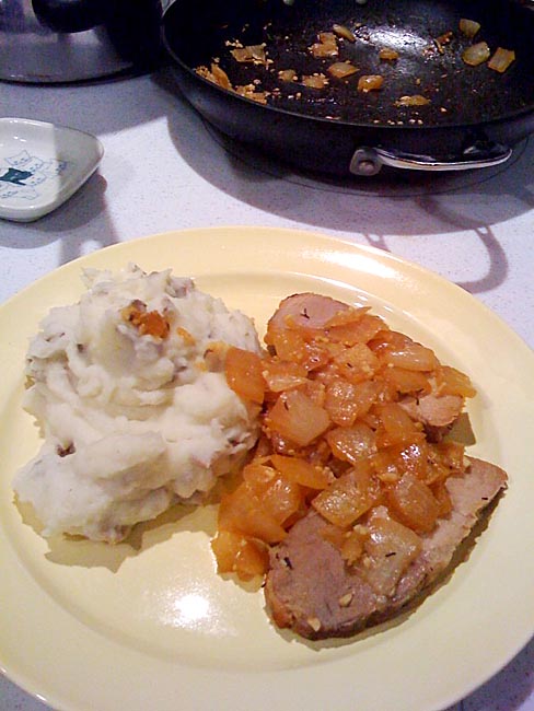Last night we got home late. Looked in the fridge. Leftover pork. So I cut up a couple of potatoes, placed in a small pot, covered with water, set to high until boiling (covered). They take about 30 minutes to be ready to mash. While waiting, I diced an onion and set it browning on medium heat. I added a bit of water every five minutes or so. You want the onion to brown but not burn too much. About six minutes before the potatoes were ready, I threw several slices of pork in with the onions.