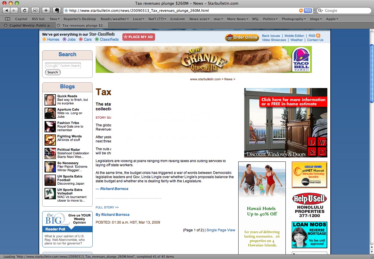[Star-Bulletin writer Burl Burlingame passed on this suggestion, which I’ll repeat here in case readers miss his comment: “For a “cleaner” version of starbulletin.com, click on “Mobile Edition.” And all stories have a single-page-view link.” Thanks, Burl.]