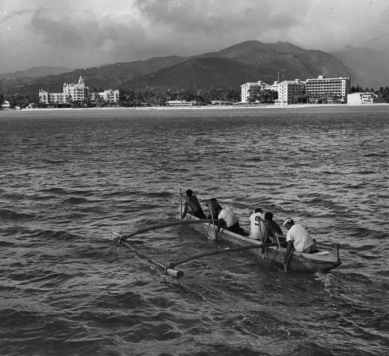 According to notes on the back of the photo, Wally Froiseth was steersman. George Downing and Dutchy Kino were in the water working on the ama, #5 position was Roy Folk, and Moki Perkins was in the #1 position.