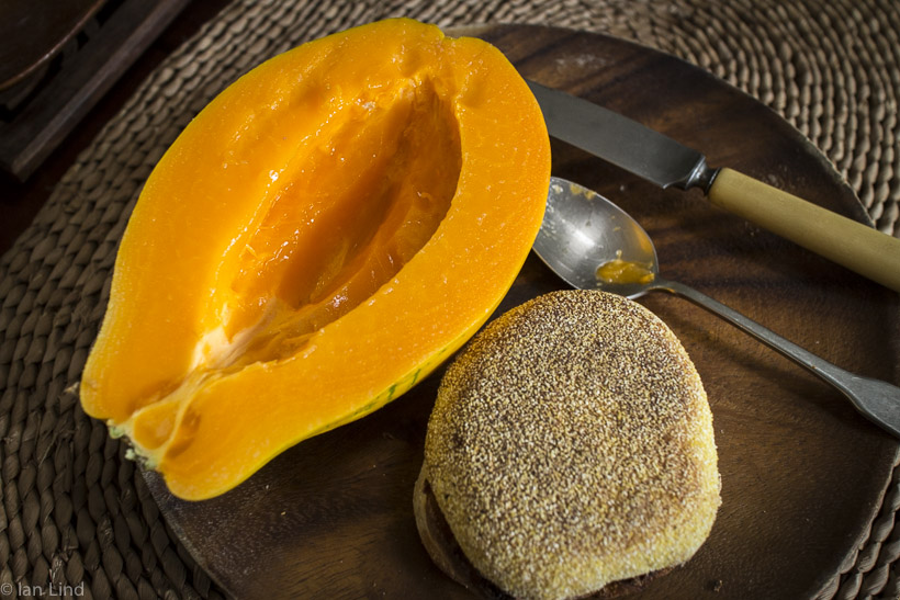 Hi Ian – wonderful to have papaia (Hawn. sp.) for breakfast. Can I give you a little hint – in my family my mother, aunts, etc. always cut off the “nose” of the fruit – makes cleaning out the seeds much simpler since they will stick to the webbing. Just a little trick from the kupuna. Aloha to Meda. Jalna