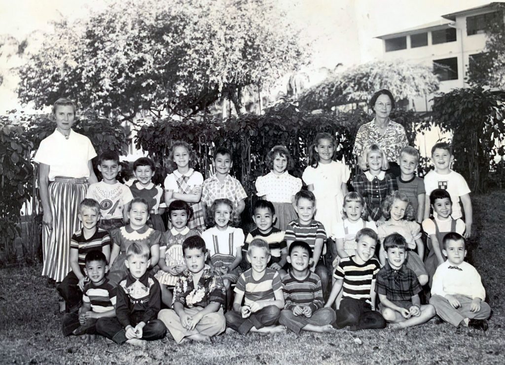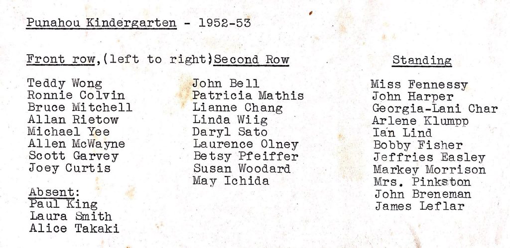 I just ran across the class photo of Ms. Fennessy’s Kindergarten class at Punahou School during the 1952-1953 school year.