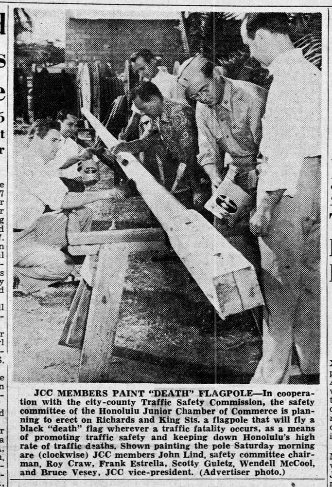 The photo, which appeared in the Honolulu Advertiser on December 4, 1944, shows members of the Junior Chamber of Commerce preparing a flagpole they were planning to erect on the corner of King and Richards streets in downtown Honolulu. The group said they would raise a flag at the corner, which would be lowered to half-staff on the day following any traffic fatality. They also planned to post fatality statistics at the base of the pole.