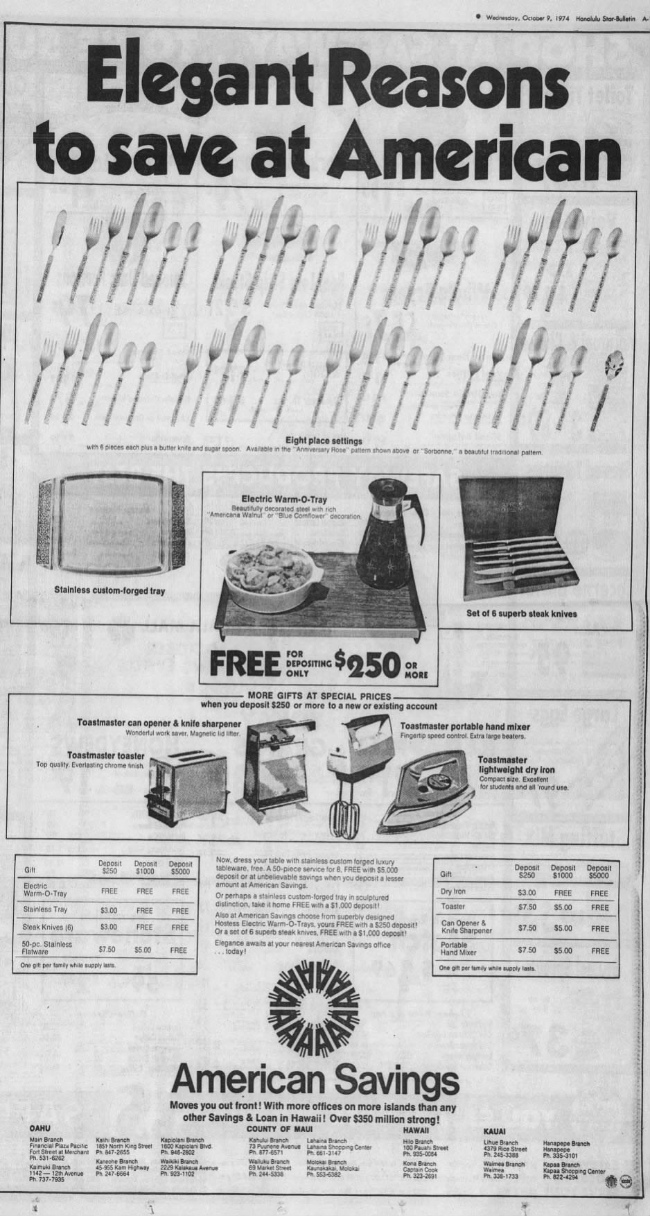 Here’s a 1974 advertisement from American Savings, displaying all the different options available. Click on the image to see a larger version.