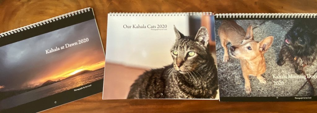 For at least 10 years, I’ve been making calendars every year featuring my photos of the dogs we meet on our morning walks, the cats that share our home, and the fantastic views we get at dawn, starting when we lived in Kaaawa, and continuing here in Kahala.
