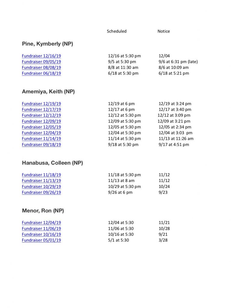 Amemiya’s campaign seems to be aiming to file their fundraiser notices close to the time of the fundraiser. Notices for six of the eight fundraisers held in 2019 were filed no more than three hours prior to the beginning of the event.