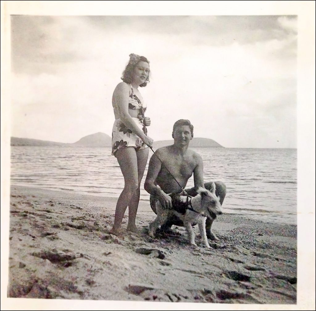 Here’s one of my parents on Kahala beach taken about 1941, with that familiar view of Koko Head and Koko Crater in the distance. At the time, they were renting a house on Kealaolu Avenue, about a block mauka from the house they would buy a couple of years later, where they lived until the end of their long lives.