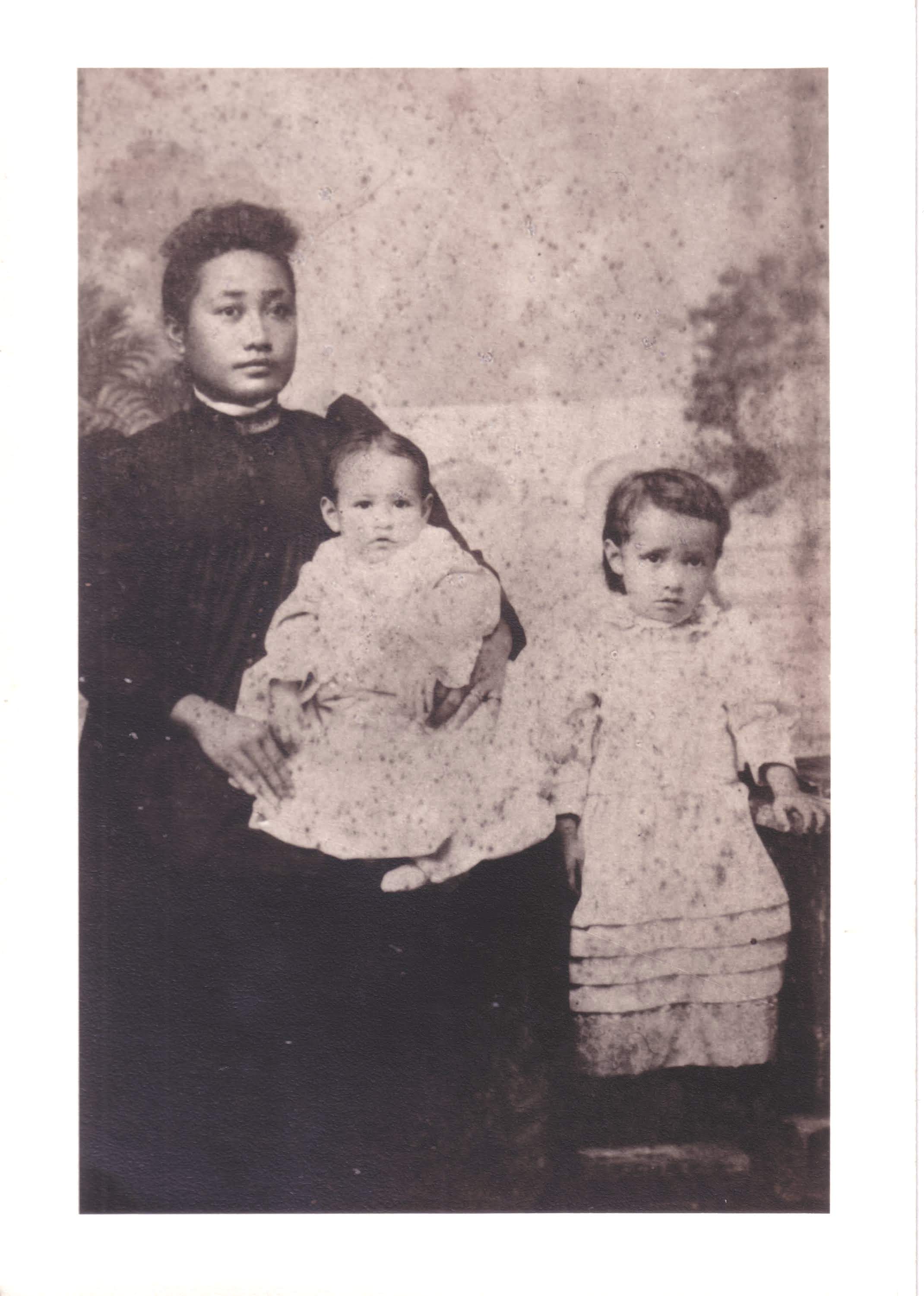 It’s a photo of my great-grandmother (my mom’s maternal grandmother), with two of her children. The older girl is my grandmother, Heleualani Eva Cathcart, and the younger is her sister, Helen Mary Kahooilimoku Cathcart.