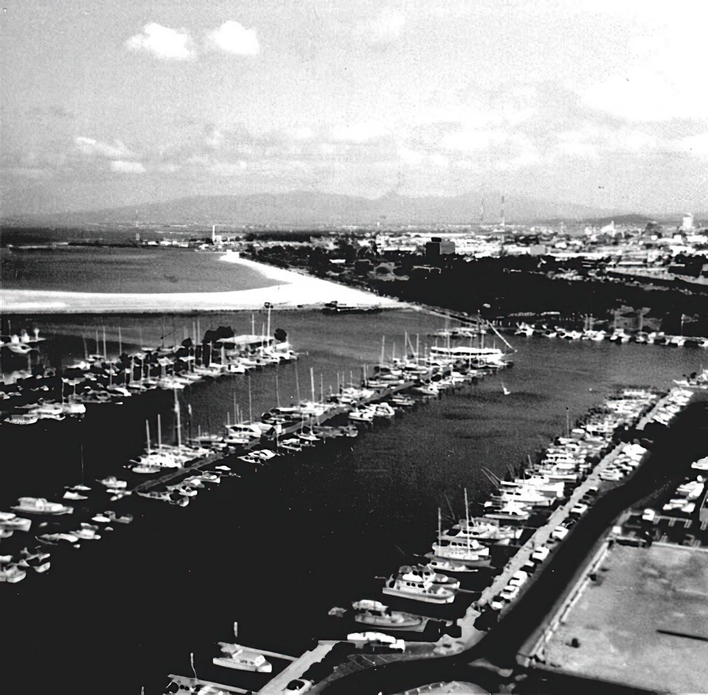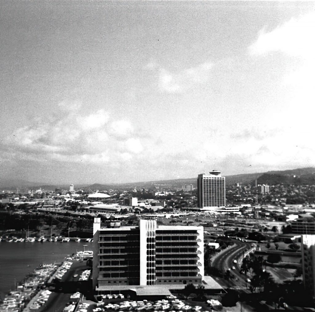There’s Kaiser Hospital. The Ala Moana Building can be seen, but the shopping center appears to be still under construction. The dome of the Blaisdell Center can be seen in the distance. High rise buildings downtown are still in the future. Magic Island is also still in the future.