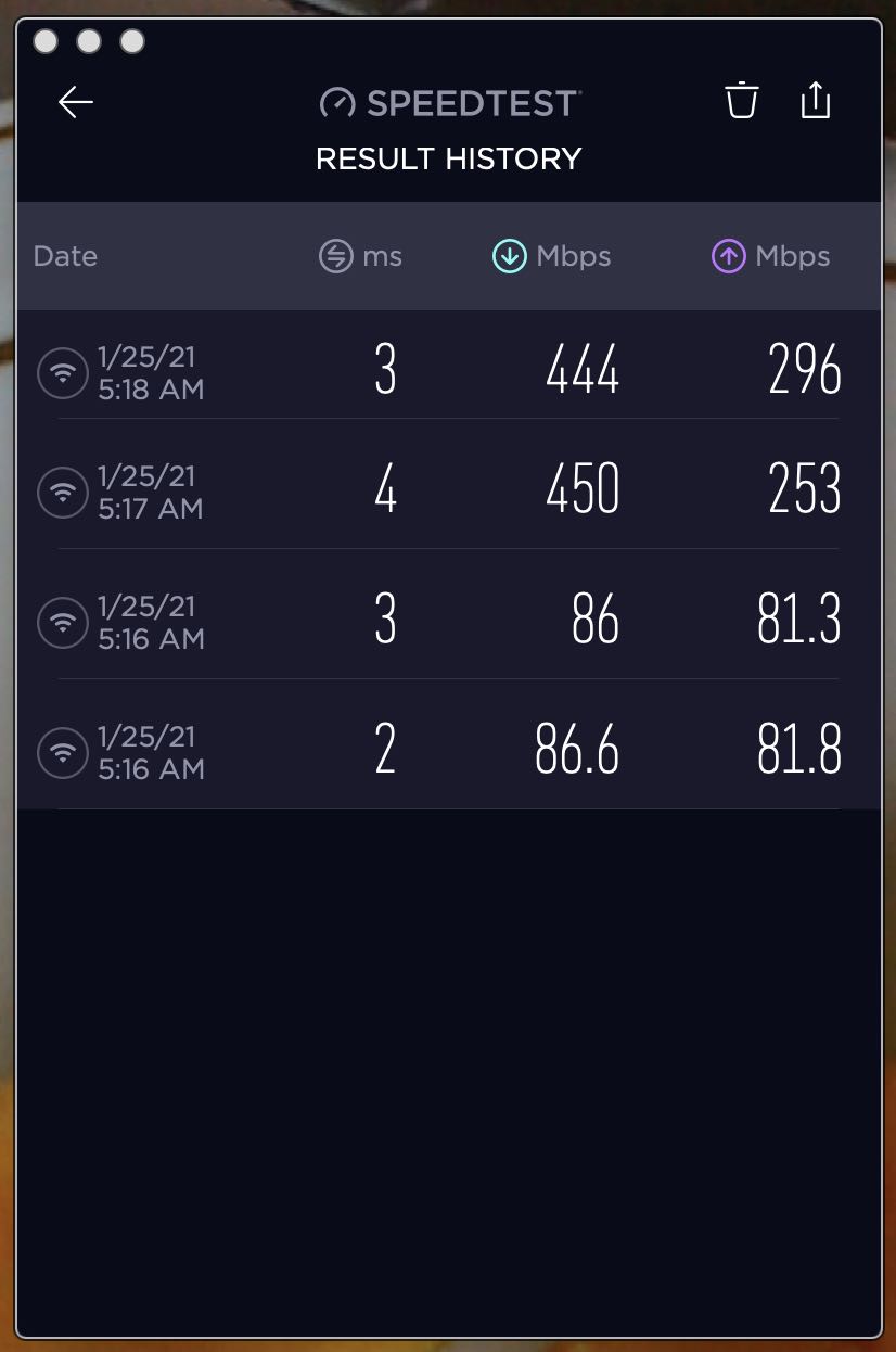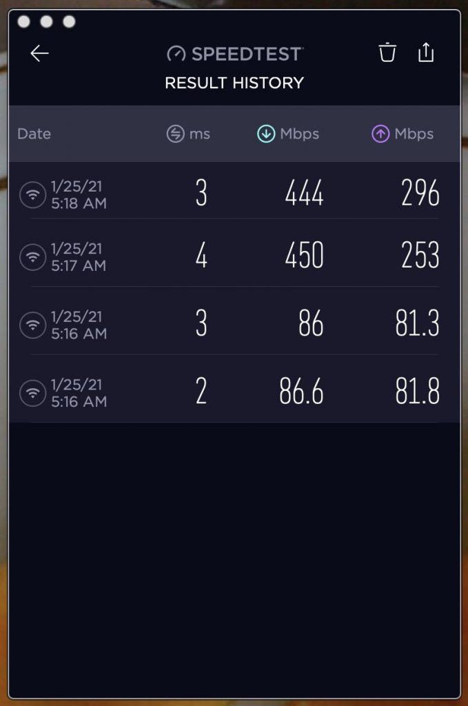 Early this morning, I ran the tests again on my Macbook Pro 16″. Twice. Here are the results for download and upload speeds. The slower results were using the Hawaiian Tel network. The faster results are Eero. Both use exactly the same internet connection via the fiber optic cable, but convert it to wifi differently. And what a difference.