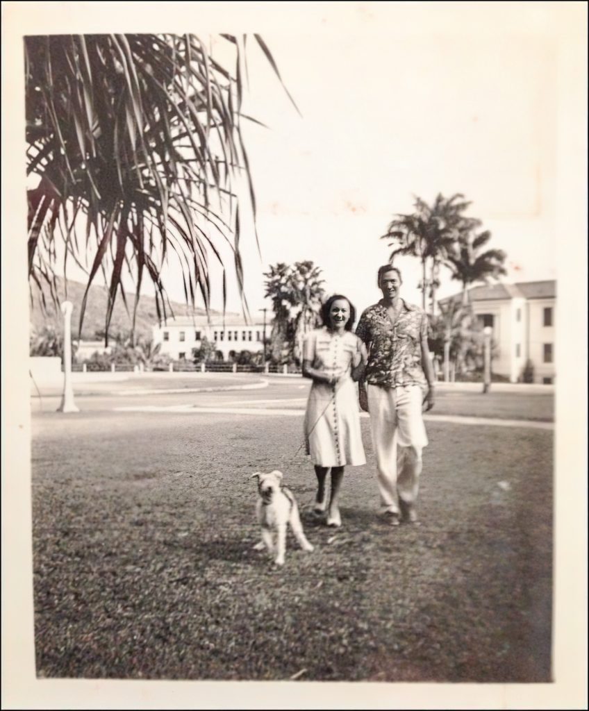 Here’s a photo of my parents, with my mother’s dog, Kiki, probably taken in the fall of 1939, just before they were married. They are walking on the lawn in front of Hawaii Hall on the University of Hawaii campus. In the background is the new Home Economics building, later named in honor of her friend and mentor, Professor Carey D. Miller.