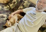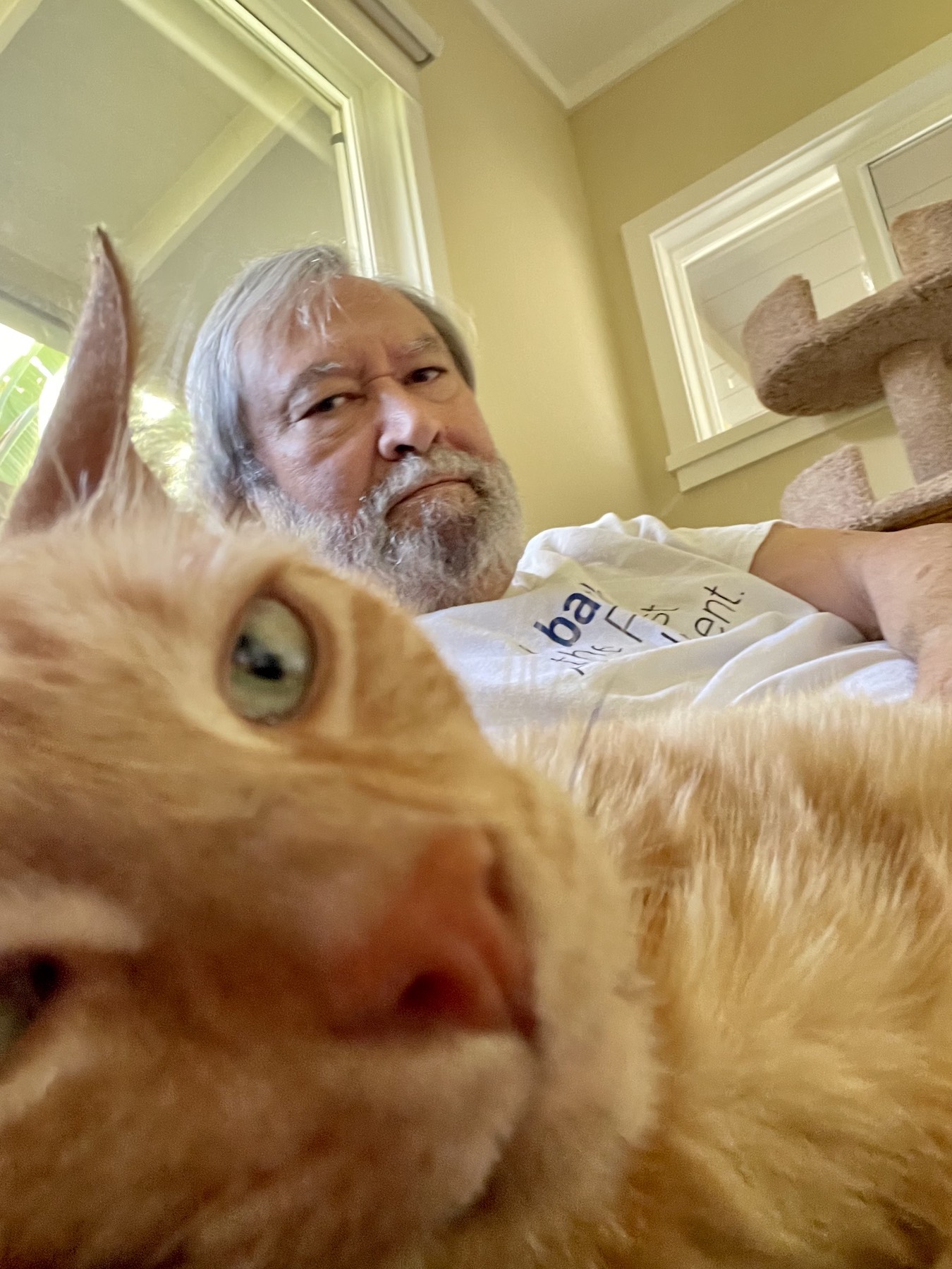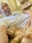 Kinikini continued his nocturnal habits today, disappearing under the futon at first light this morning, then emerging to lounge atop his cat tree, but scampering back down into hiding whenever I checked on him. When I peeked in about 4 p.m., he first jumped down and hid, but when I sat and waited, he soon emerged, jumped back up to sit next to me, and then started a love-a-thon, purring, walking back and forth across me, curling up first on one side then on the other, and just generally really getting into it. And I have to report one more thing. This cat is a drooler! The more he purrs, the more he drools.