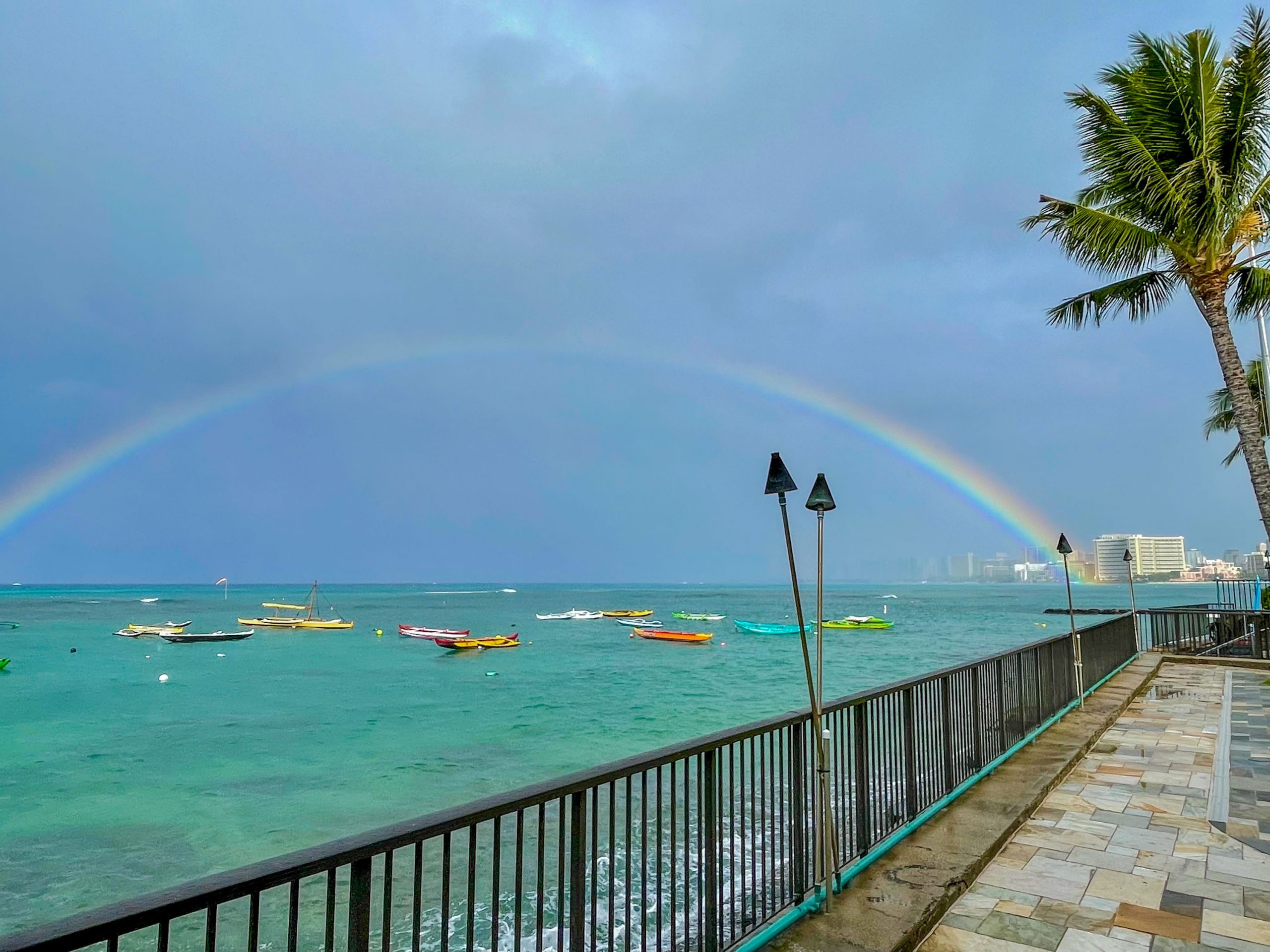Good pix, the different colored boats and colors in rainbow compliment each other. Did you take another picture without the railing?