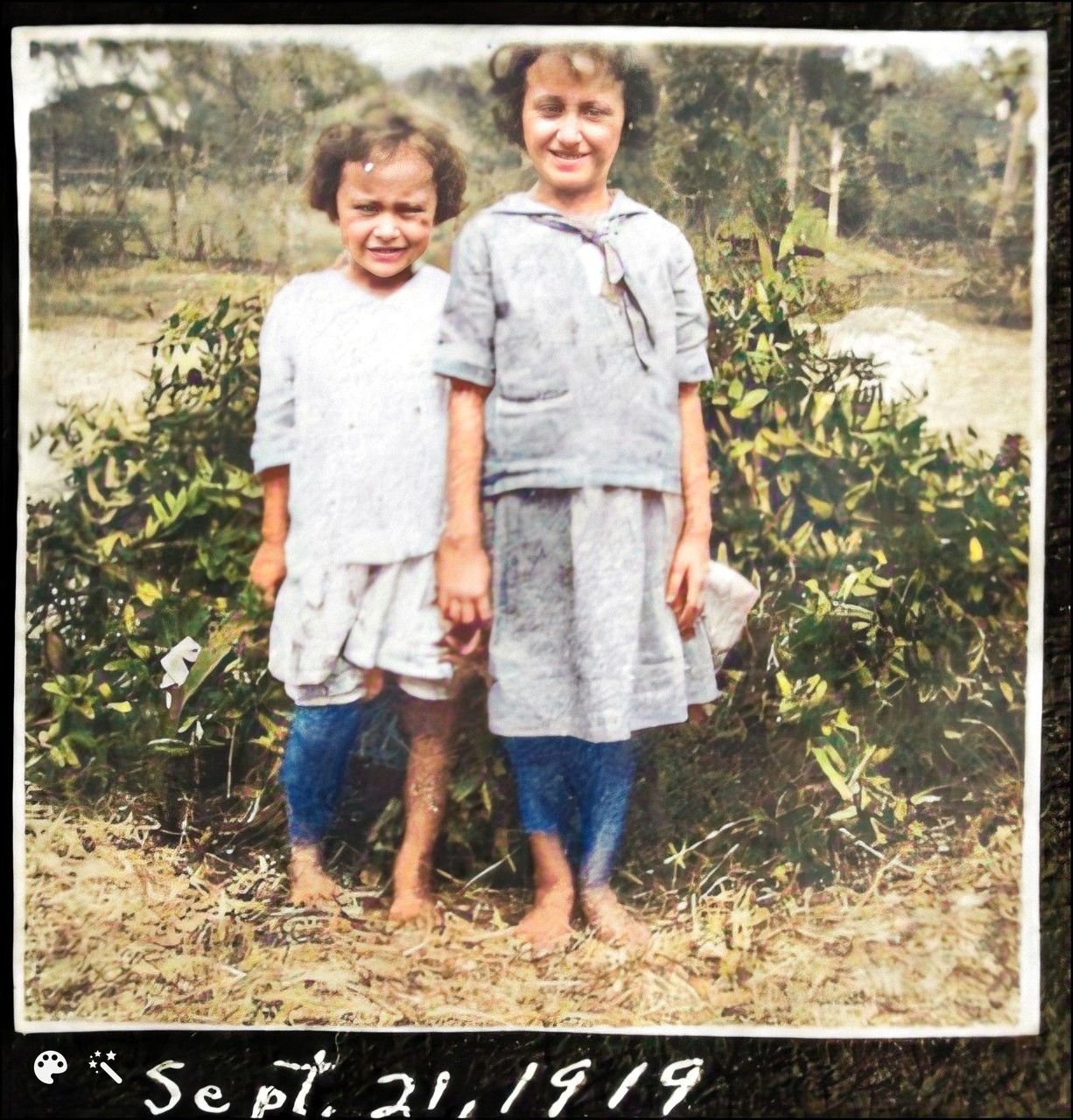 By the way, here’s a photo of my mother and her older sister, Marguerite, in 1919. It’s been colorized and enhanced by the genealogy website, myheritage.com. [I just noticed that what appear to be blue jeans are not there in the original B&W photo, their legs are bare. So this is apparently an artifact of the colorization software.]