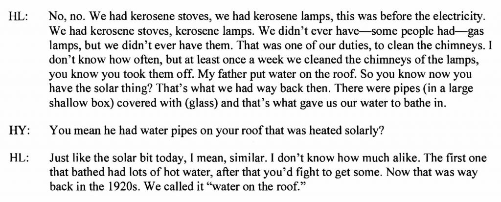 She describes living off the grid, growing all of their own vegetables except watercress, which they purchased from the Sumida watercress farm, which still appears to be our main source of watercress. They didn’t have electricity, but had an icebox, and believes they purchased blocks of ice from the Sumida family as well. They and other homesteaders had water pumped from a well about a mile away. They had kerosene lamps and a kerosene stove, and even had solar hot water.