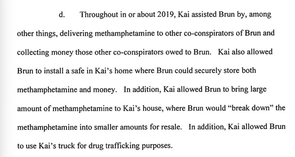Sometime in the spring of 2019, Kai met Brun. “On one occasion when both men were hanging out together, Brun provided methamphetamine and a pipe to Kai; thereafter, Kai began to use methamphetaine again,” according to the plea agreement filed in federal court.