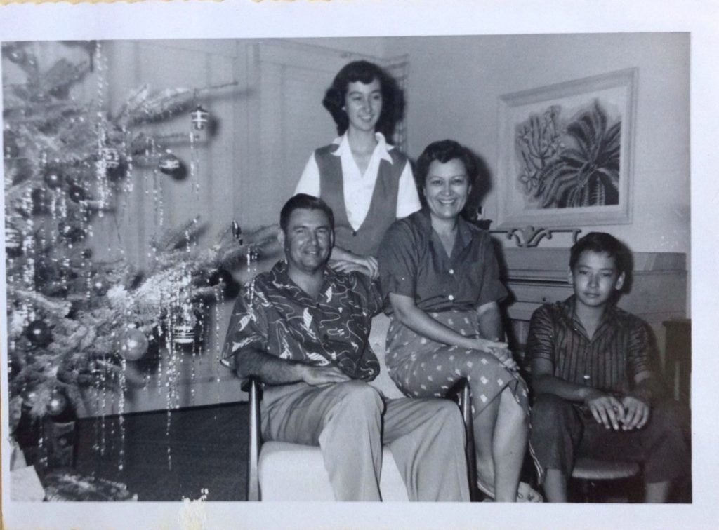 So here’s one from Christmas morning 1958, taken in our living room here in Kahala with my parents and my older sister, Bonnie, with a fully dressed tree.