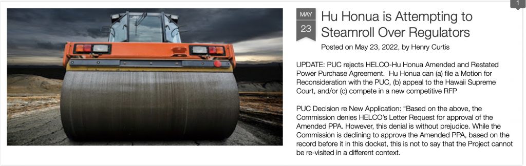 This post ticks off the multiple ways Hu Honua is exerting lobbying, advertising, and political pressure in an attempt to breath life back into their costly proposal. Highly recommended reading.