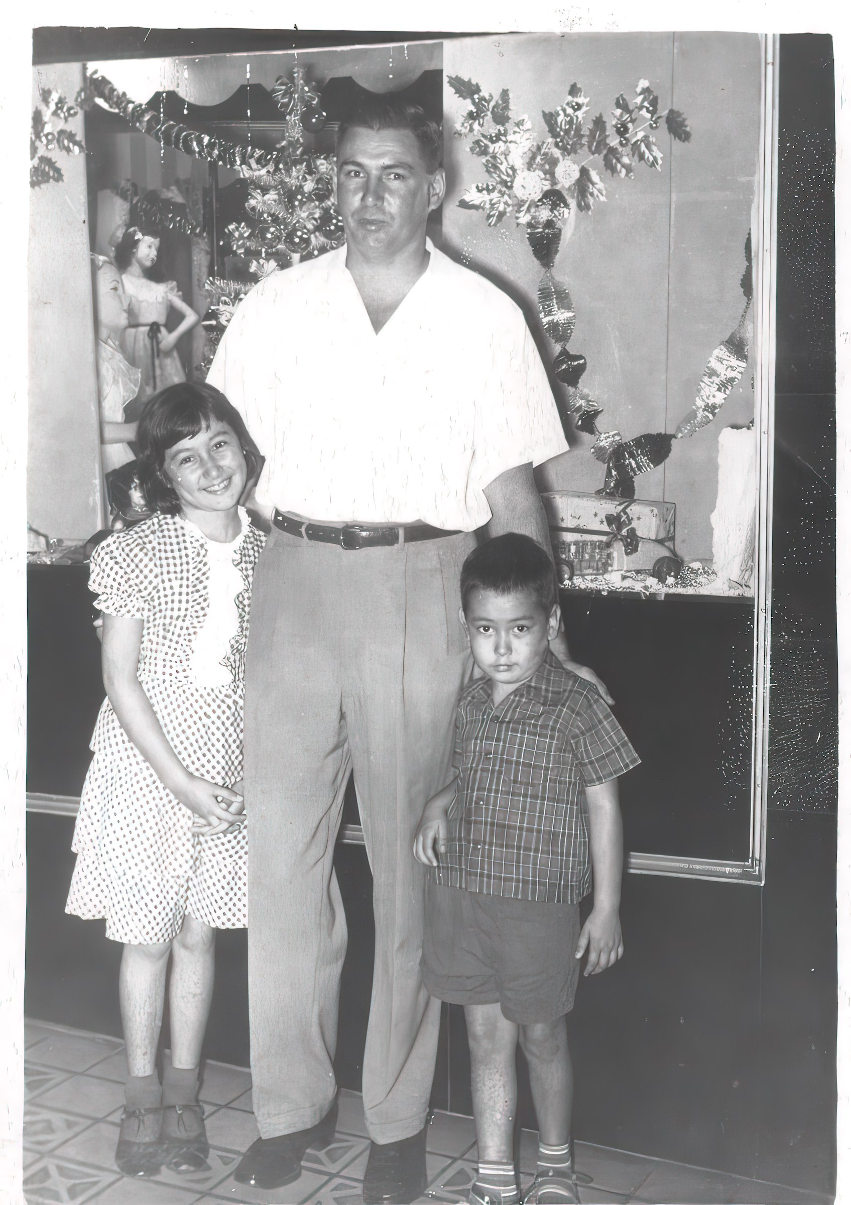 Next photo was taken sometime around Christmas in 1951. My dad took my sister, Bonnie, and me to look at the holiday display. I think this was at the original Sears store in Honolulu, along Beretania just past Kalakaua Avenue. I imagine it was a happy outing.
