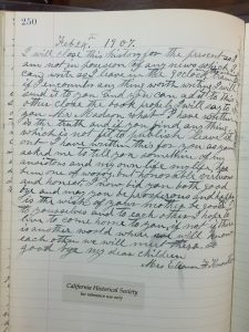 This is the 21st day of Feb and we are having very cold weather with heavy fog and I am getting ready to visit my daughter Mrs. Helene Yonge who lives in San Francisco. Although I am in my 73* year I feel that I can make the trip alright. I had made up my mind not to take any more trips and I now feel as I shall never take any more I live to get home again. I have no home of my own. But I have lived with Mr. Madson my son-in-law and his wife so long it is hard for me to go away and leave them even for a visit.
