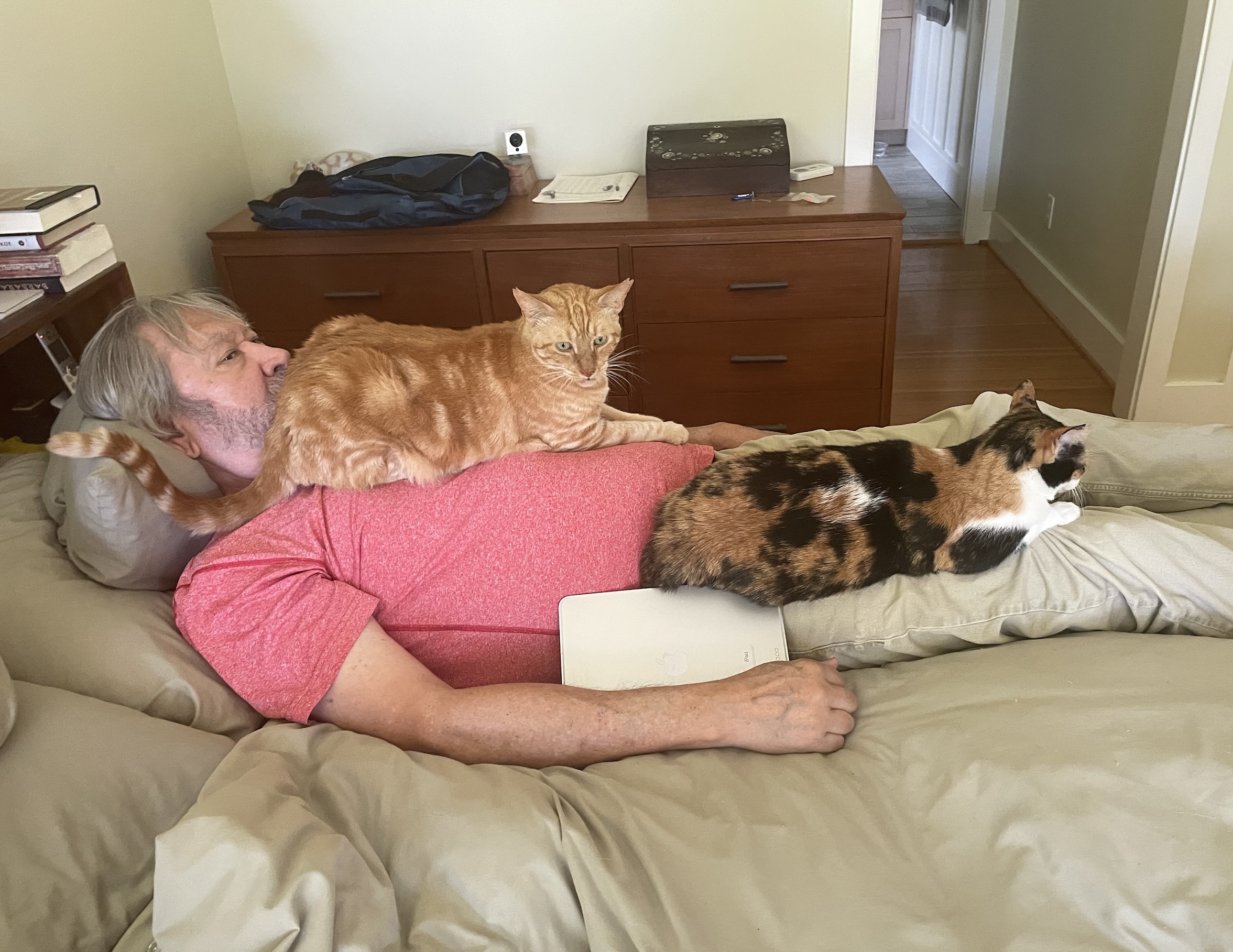 That photo made me laugh too. You are clearly a comfortable cat pillow and they don’t want you to leave again.