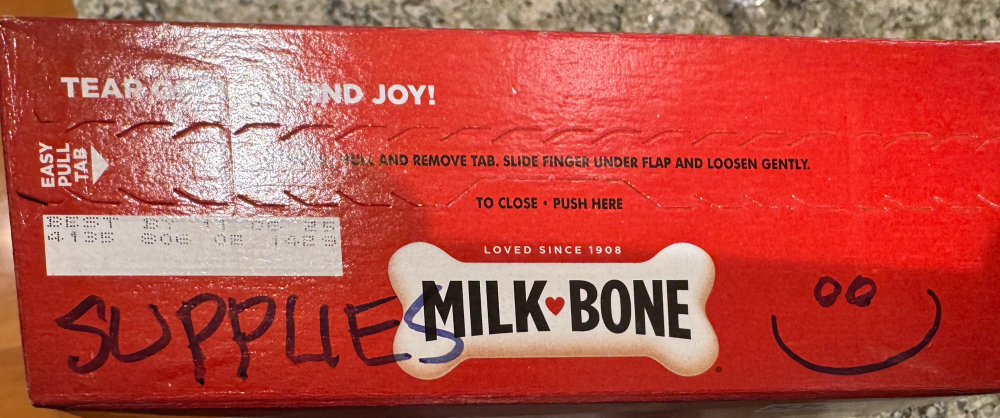 Then there was an unopened box of Milk Bone dog biscuits with two messages written in black ink.