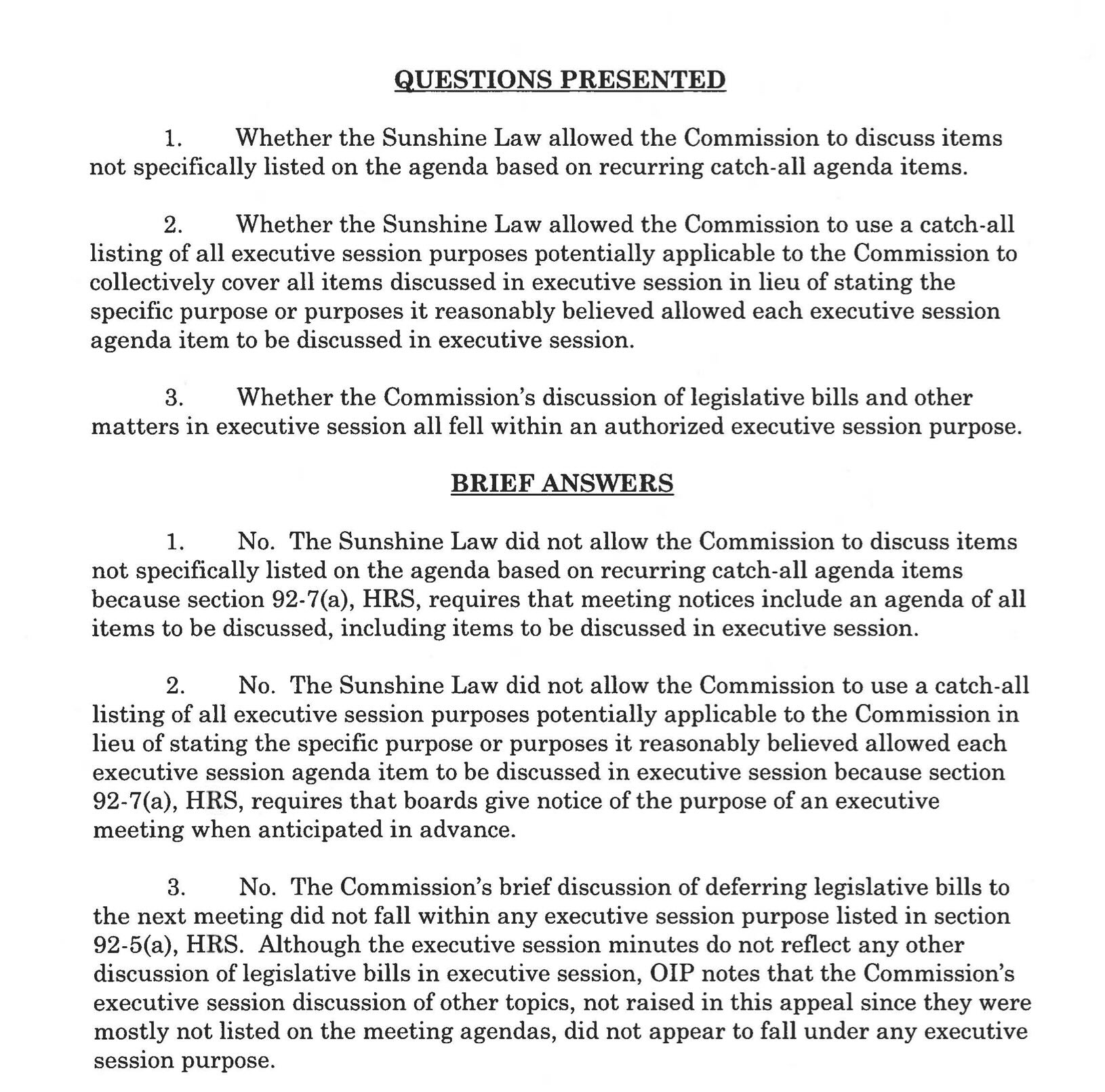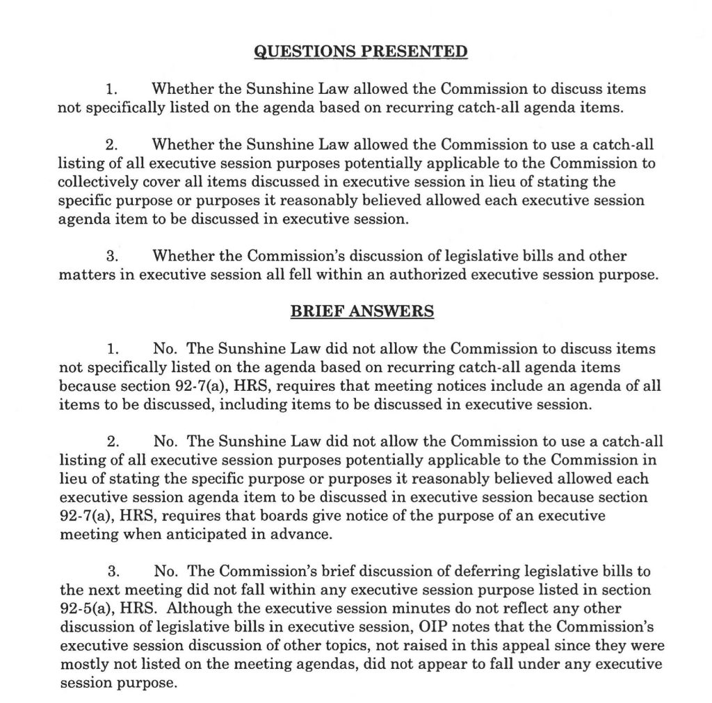 I was glad to see the opinion made it very clear what the Sunshine Law covers with respect to the questions asked. They also footnoted an exception for neighborhood boards, which is important to understand.