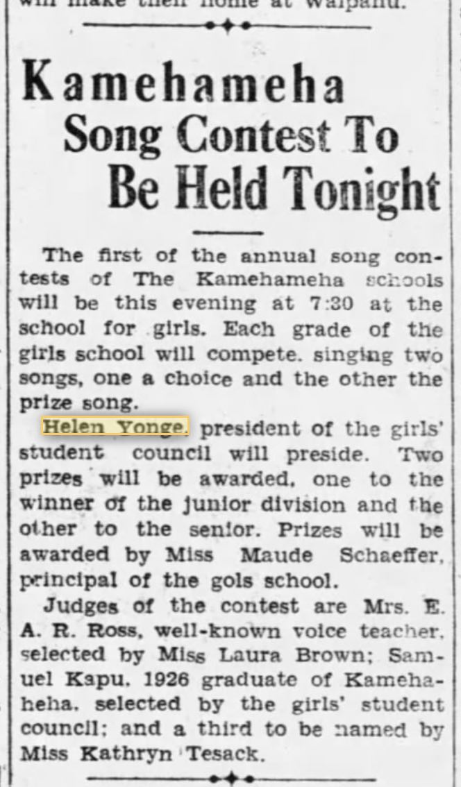 During her senior year, my mother was president of the student council at the Kamehameha School for Girls, and in that capacity presided over the annual song context, held on November 4, 1930. The Honolulu Advertiser ran a news brief about the contest that mentioned her role.