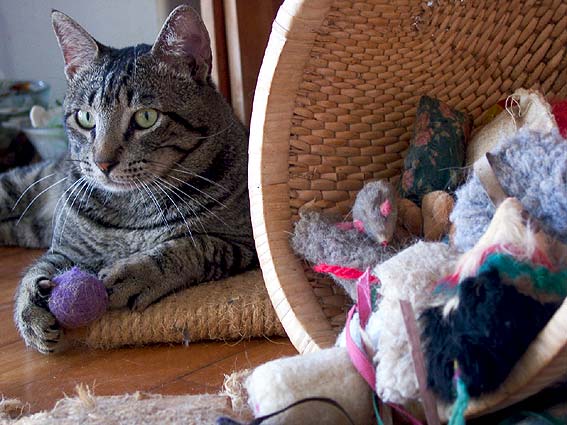 That’s Romeo in the photo with his new collection of toys. He didn’t have much trouble making the transition from wandering outside cat to (mostly) indoor pampered cat.