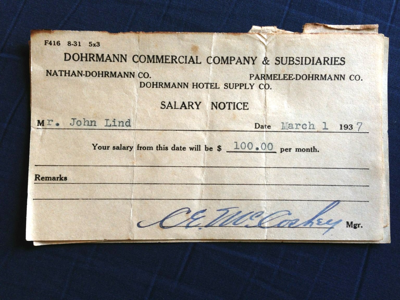 So when he received this salary notice, he had been working for Dohrmann for four years and was already a salesman. And all that work earned him $100 a month.