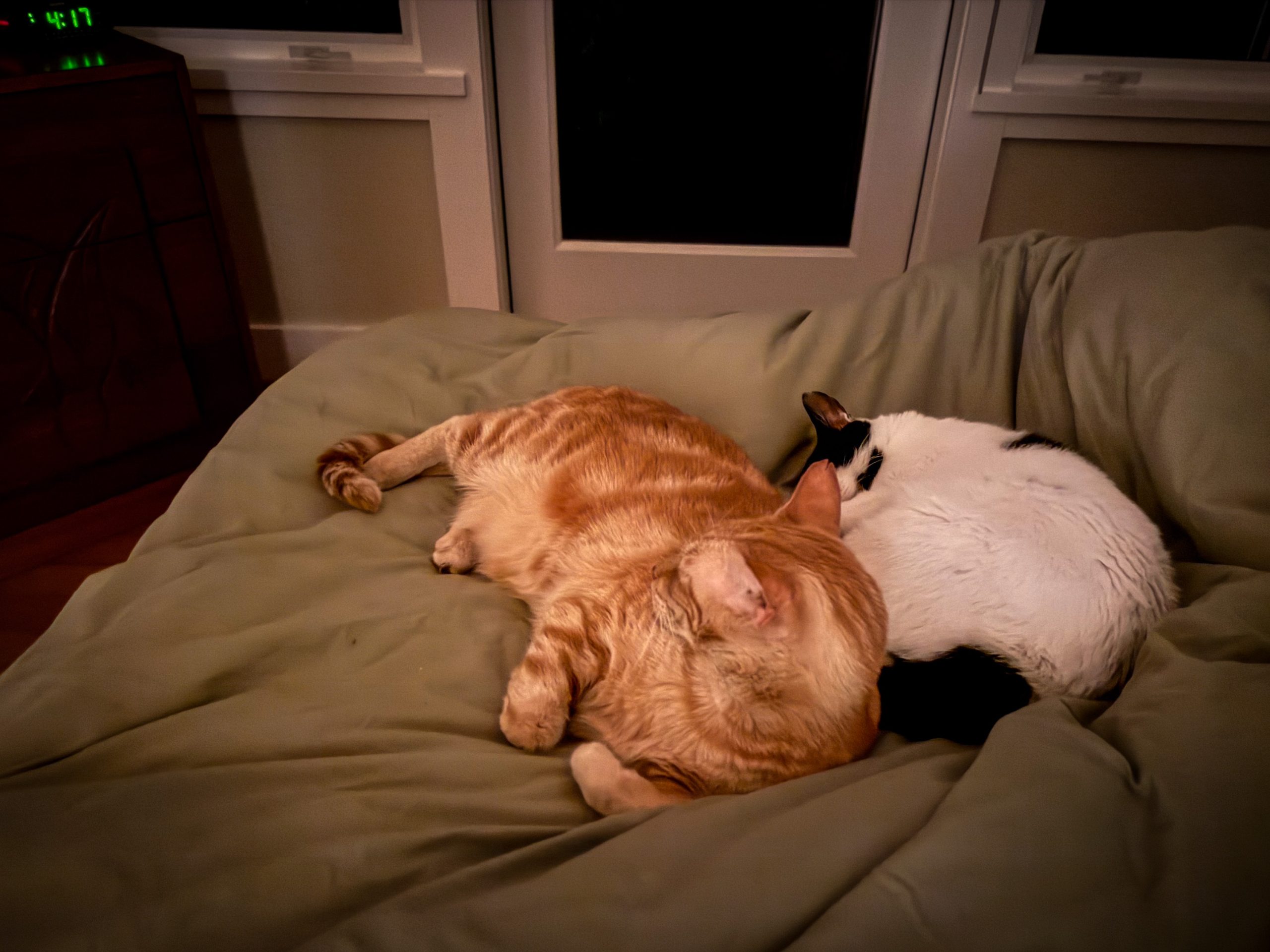 And then within the past week, I woke up early and, much to my surprise, found Kinikini sleeping next to Kiko. I think they were even touching! I decided to take a photo “for the record.” The first attempt failed. It was just too dark. So I dragged myself out of bed, turned on a light in the hallway to the bathroom, and tried again. The clock said it was 4:17 a.m. This time my iPhone went into it’s night mode, instructed me to hold the phone still, and got the photo!