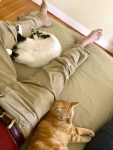 But when we unsuccessful at introducing her to our bed, where prior generations of our cats tended to congregate many nights. I finally began carrying her into the bedroom and depositing her on the bed, trying to plant the idea that it is permitted behavior. But I’m afraid that the first couple of times Kinikini gave her a swat and sent her running.