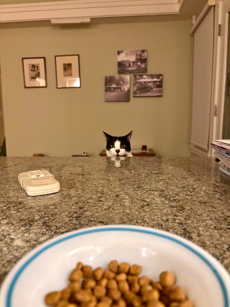 Our cat sitter sent this photo of Ms. Kiko keeping an eye on a freshly filled dish of cat food on the kitchen counter.