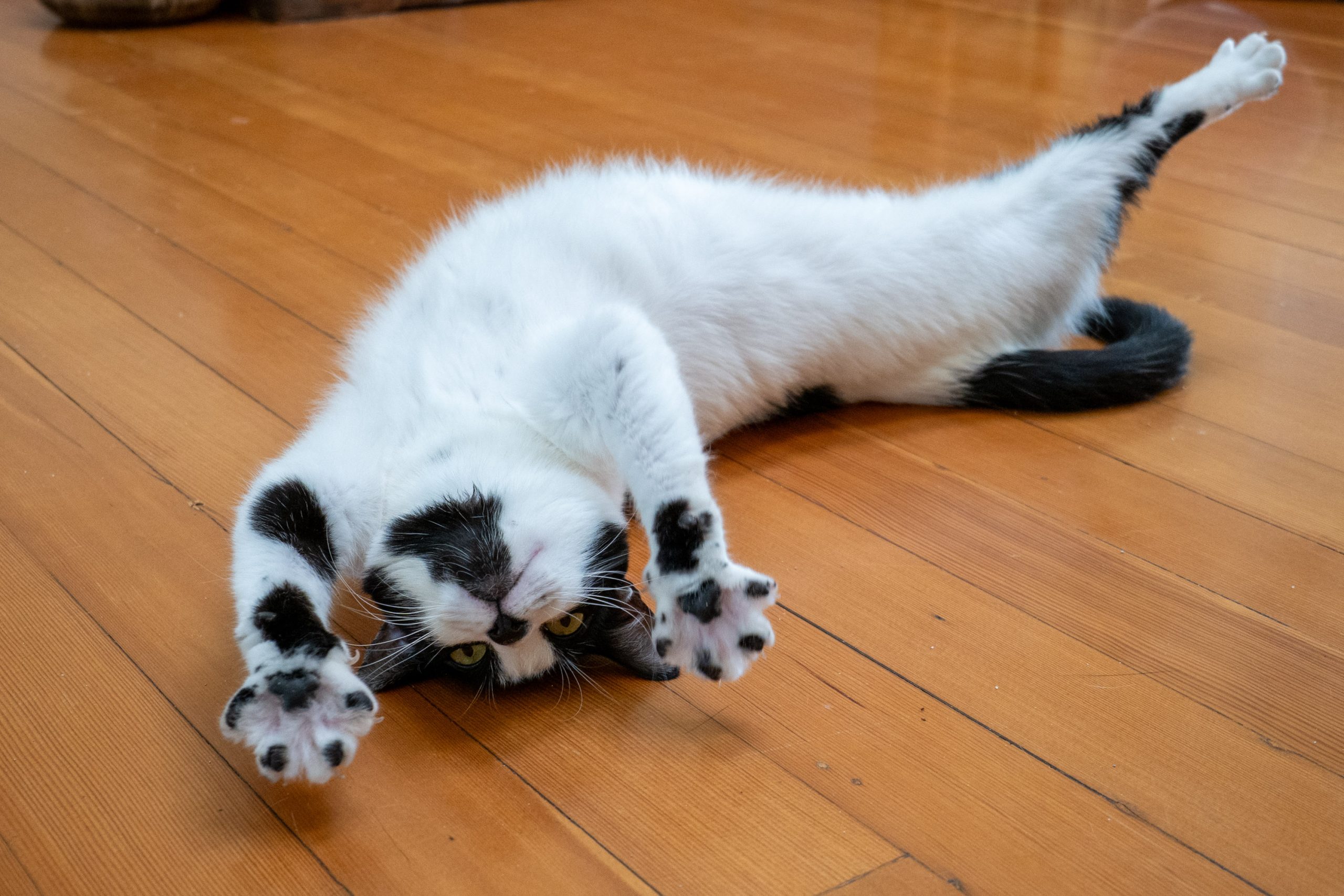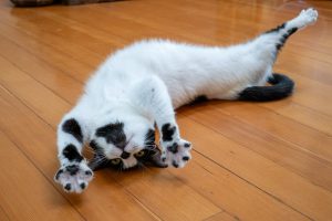 And Kiko is all about spots. She has large black spots on her shoulders. “Like angel wings,” one visitor to the house said recently. There are black spots on her legs, small random spots in her fur, and in this photo you see the spots on the bottom of her paws that are usually hidden.