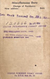 The stamps on his ID card indicate he was issued a gas mask on January 6, 1942, and received a liquor purchaser’s permit on February 27. In addition, he received smallpox and typhoid vaccinations in 1942, and a typhoid booster in 1944.